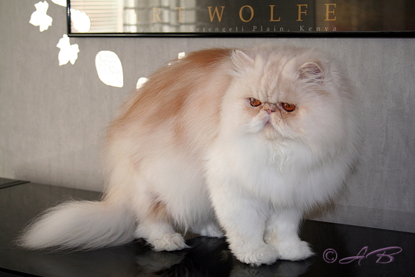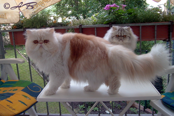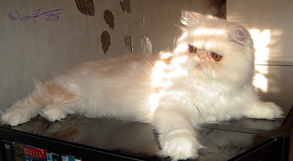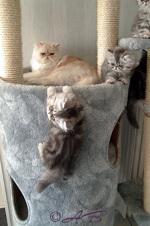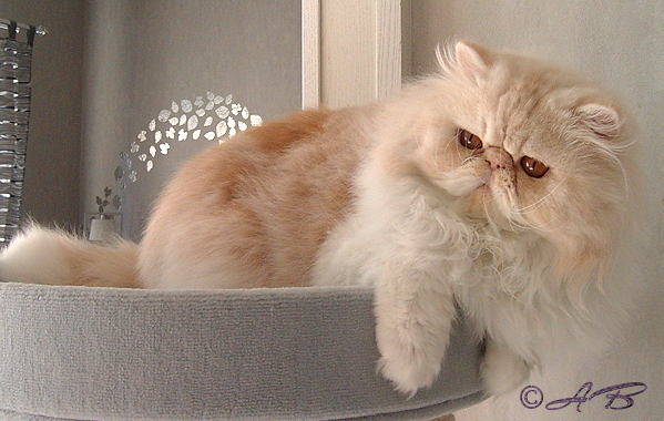 Blondie war einer unserer ersten Perser in der Farbe "silver-tabby", und auch unser erster Zuchtkater in silvertabby. Wir haben ihn mit 8 Monaten beim Züchter gesehen und uns für ihn entschieden. Er war schon immer ein lieber Kater, gesprächig und immer freundlich. Als unsere Molly hier ankam war er so geduldig mit ihr. Nie ein Fauchen oder Knurren von seiner Seite .... dafür umso mehr von ihrer :-). Heute hat sich das Bild völlig gewandelt und sie liebt ihn sehr. Ständig wird an ihm genuckelt!